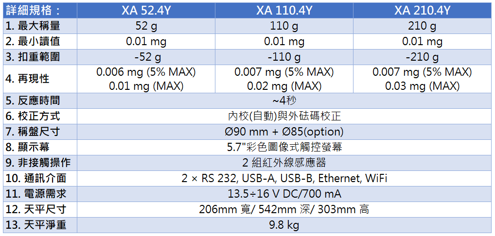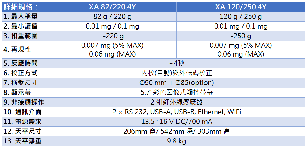小數下五位解析度(0.00001g, 0.01mg),XA.4Y配備高階5.7"彩色圖像式觸控螢幕,為高精度多功能天秤。符合美國藥典(USP)最小秤量規範,奠定質量測量新基準。