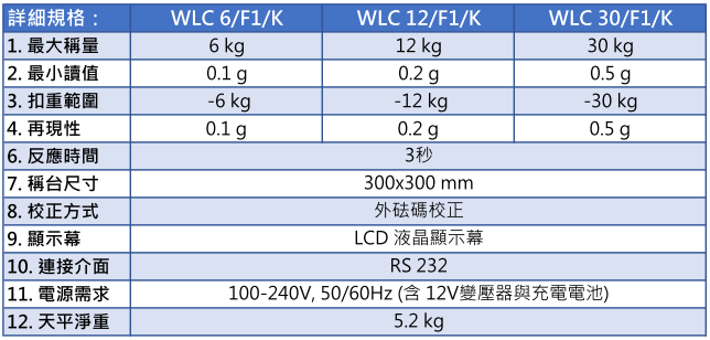 小數下一位解析度(0.1g),WLC具備大型化不鏽鋼秤盤,能秤量6~30Kg之物件。內建長效充電模組,可攜帶移動使用、或在無電源環境中操作。C2/K及F1/K型螢幕可分離擺放,適應工作場所多元化的需求!