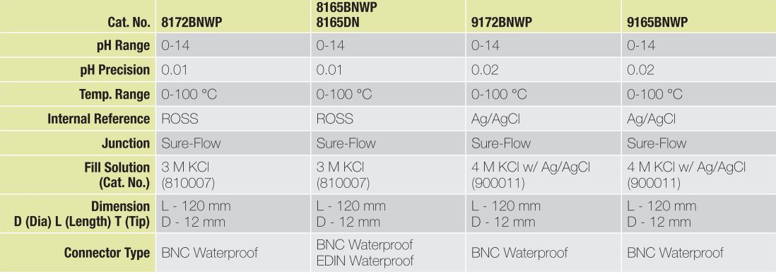 Thermo Scientific Orion 電極系列大致可分為pH、ORP及ATC溫度電極,pH系列又可分為長效型(Sure-Flow)、內建溫度補償型(Triode)、電解液填充型(Refillable)、塑料本體電解液填充型(Epoxy Refillable)、微量量測型(Micro)、半微量量測型(Semi Micro)等,提供實驗室及研究單位使用者更多元的選擇方案