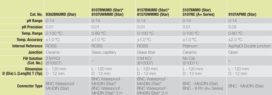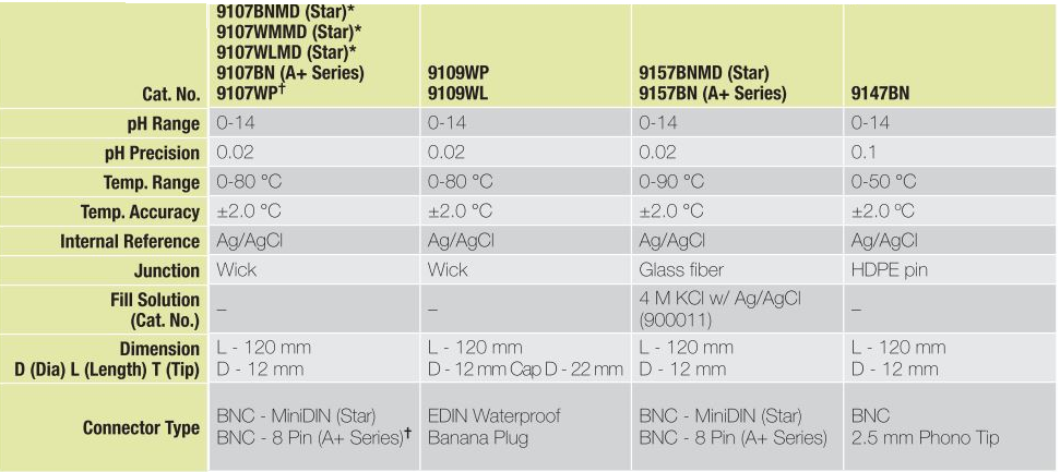 Thermo Scientific Orion 電極系列大致可分為pH、ORP及ATC溫度電極,pH系列又可分為長效型(Sure-Flow)、內建溫度補償型(Triode)、電解液填充型(Refillable)、塑料本體電解液填充型(Epoxy Refillable)、微量量測型(Micro)、半微量量測型(Semi Micro)等,提供實驗室及研究單位使用者更多元的選擇方案