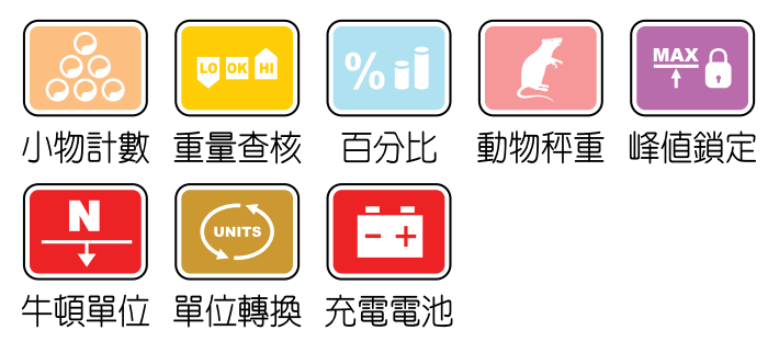 4. 多種秤重模式:小物計數、單位轉換、百分比、重量查核、動物秤重、峰值鎖定、淨/毛重... 多種機能,另可儲存預扣重、具按鍵聲響及讀值穩定顯示