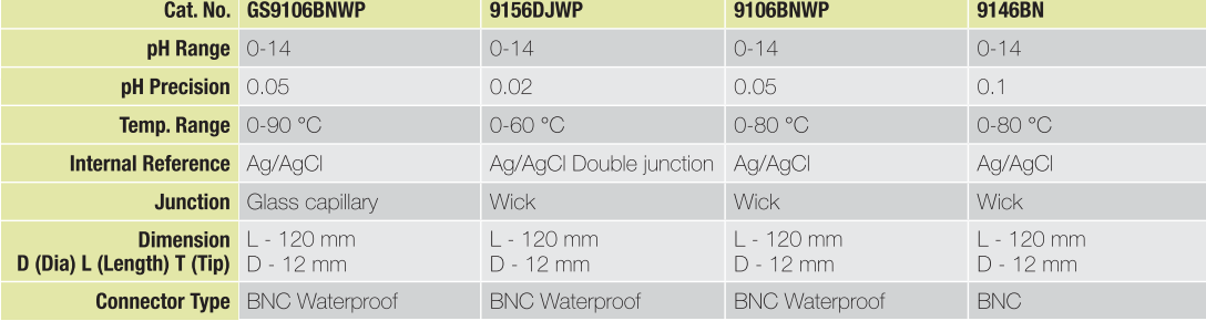 Thermo Scientific Orion 電極系列大致可分為pH、ORP及ATC溫度電極,pH系列又可分為長效型(Sure-Flow)、內建溫度補償型(Triode)、電解液填充型(Refillable)、塑料本體電解液填充型(Epoxy Refillable)、微量量測型(Micro)、半微量量測型(Semi Micro)等,提供實驗室及研究單位使用者更多元的選擇方案