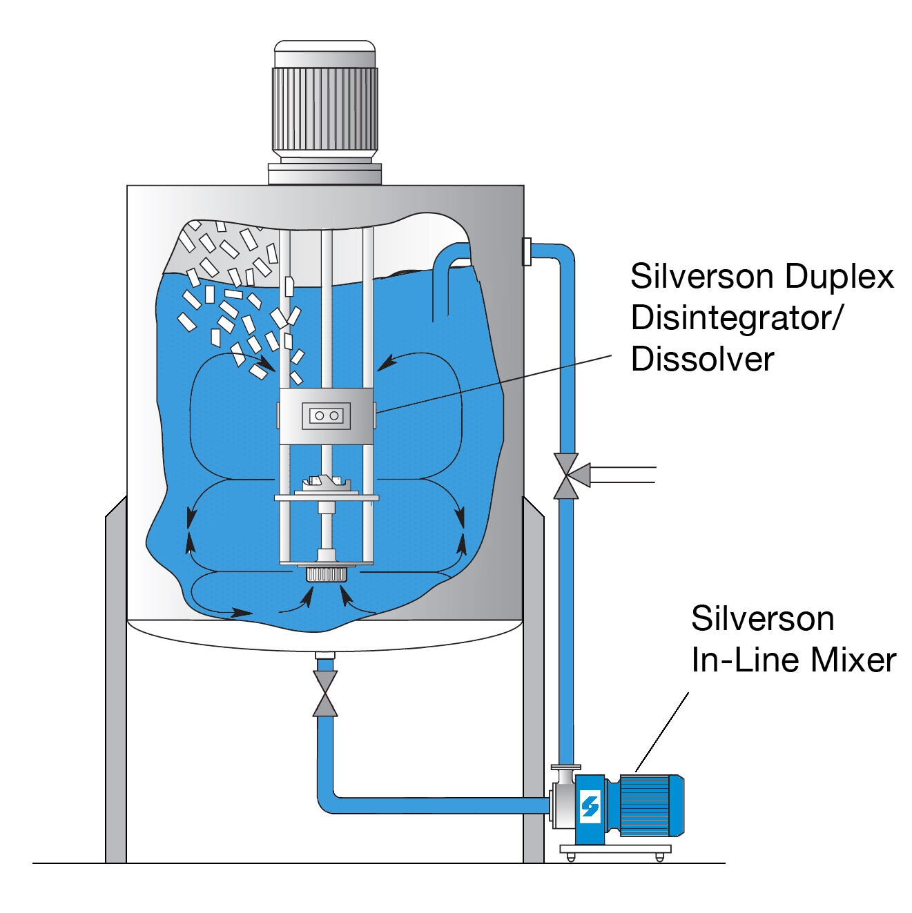 可搭配線上均質機使用,當固體顆粒減小的一定程度時,即可開啟線上型均質機,達到更迅速的溶解與分散均質效果。