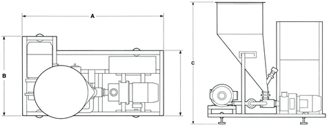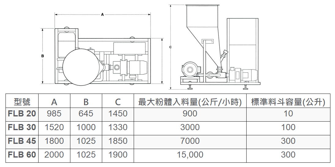 型號 A B C 最大粉體入料量(公斤/小時) 標準料斗容量(公升)