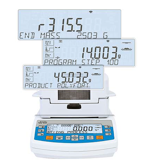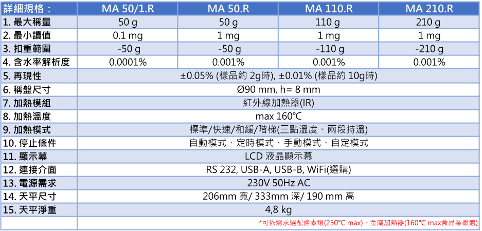 0.0001%高水份解析度,MA.R配備大型背光LCD 顯示可即時顯示多項設定參數,操作簡單快速!另可選配金屬加熱器及鹵素加熱燈。