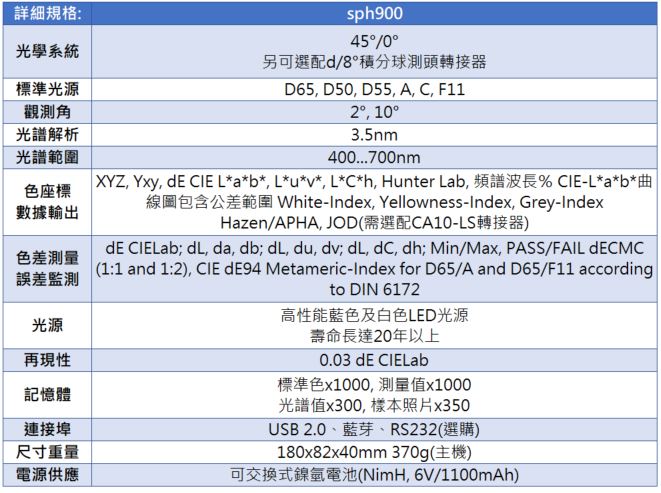 德國ColorLite sph900分光光度色差計,具備45°/0°及d/8°雙光學系統合一、能針對不同樣本或測量一機多用。只要將測頭對準樣本、輕壓2秒鐘立即完成測量!迷你型測頭適合小樣本或曲面物件(最小直徑3.5mm)皆可直接測量!