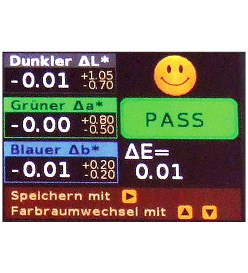 dE CIELab; dL, da, db; dL, du, dv; dL, dC, dh; Min/Max, PASS/FAIL dECMC (1:1 and 1:2), CIE dE94 Metameric-Index for D65/A and D65/F11 according to DIN 6172
