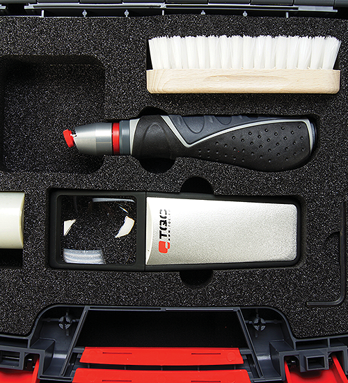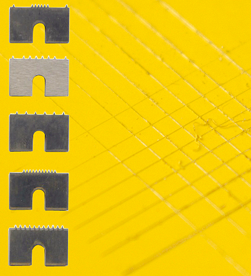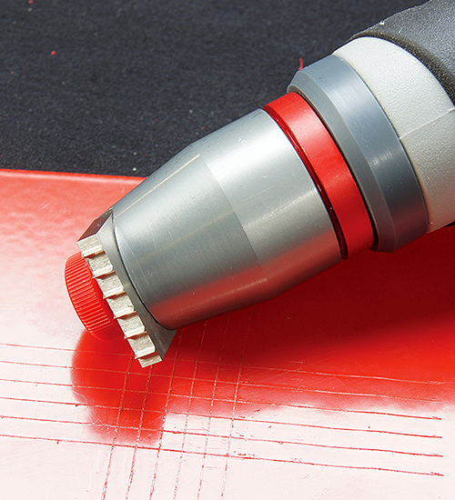 以不同規格之多片刀頭,在漆面作90度交叉切割,用硬毛刷掃去碎屑,用3M標準測試膠帶黏貼後(針對硬質底材)