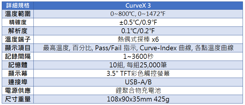荷蘭TQC原裝進口。CurveX 3 爐溫記錄器, 專為測試及記錄高溫爐體, 烤漆房內之溫度變化所設計, 可同時安裝6支溫度探棒, 提供詳盡而完整的爐溫紀錄報告, 是您進行爐溫測定的最佳選擇! CurveX 3 爐溫記錄儀可單機使用, 同時搭配原廠精心設計的 Ideal Finish 電腦軟體, 可將爐溫數據下載至電腦進行紀錄與比對, 是功能最完備的爐溫紀錄儀!