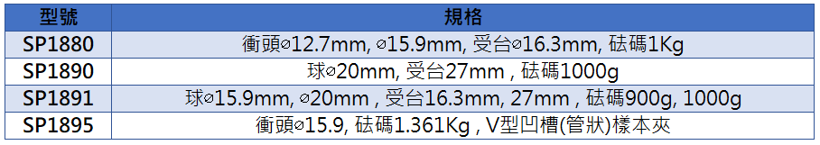 SP1880 衝頭∅12.7mm, ∅15.9mm, 受台∅16.3mm, 砝碼1Kg
