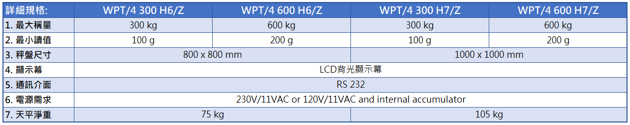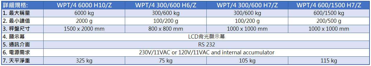 詳細規格 WPT/4 600/1500 H9/Z WPT/4 1500/3000 H9/Z WPT/4 1500/3000 H10/Z WPT/4 3000/6000 H10/Z