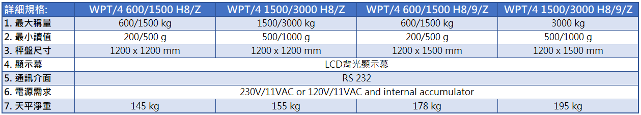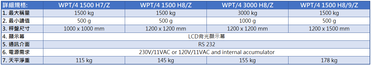 3. 秤盤尺寸  1500 x 1500 mm 1500 x 1500 mm 1500 x 2000 mm 1500 x 2000 mm
