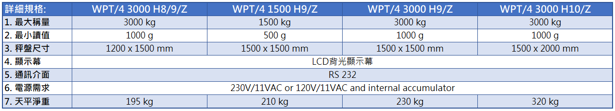 詳細規格 WPT/4 3000 H8/9/Z WPT/4 1500 H9/Z WPT/4 3000 H9/Z WPT/4 3000 H10/Z