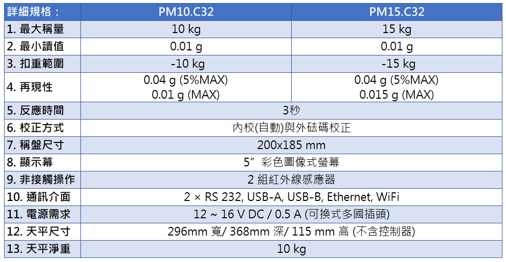 12. 天平尺寸 296mm 寬/ 368mm 深/ 115 mm 高 (不含控制器)