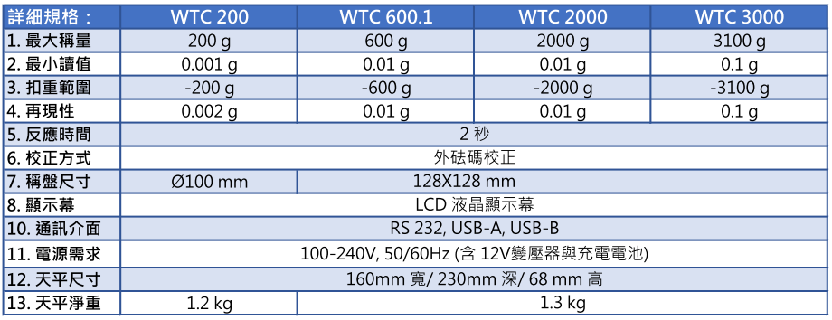 小數下一位解析度(0.1g),WTC內建長效充電池,可在無電源環境使用;內建多種常用秤重功能,提供與實驗室內相同等級的秤量精度!