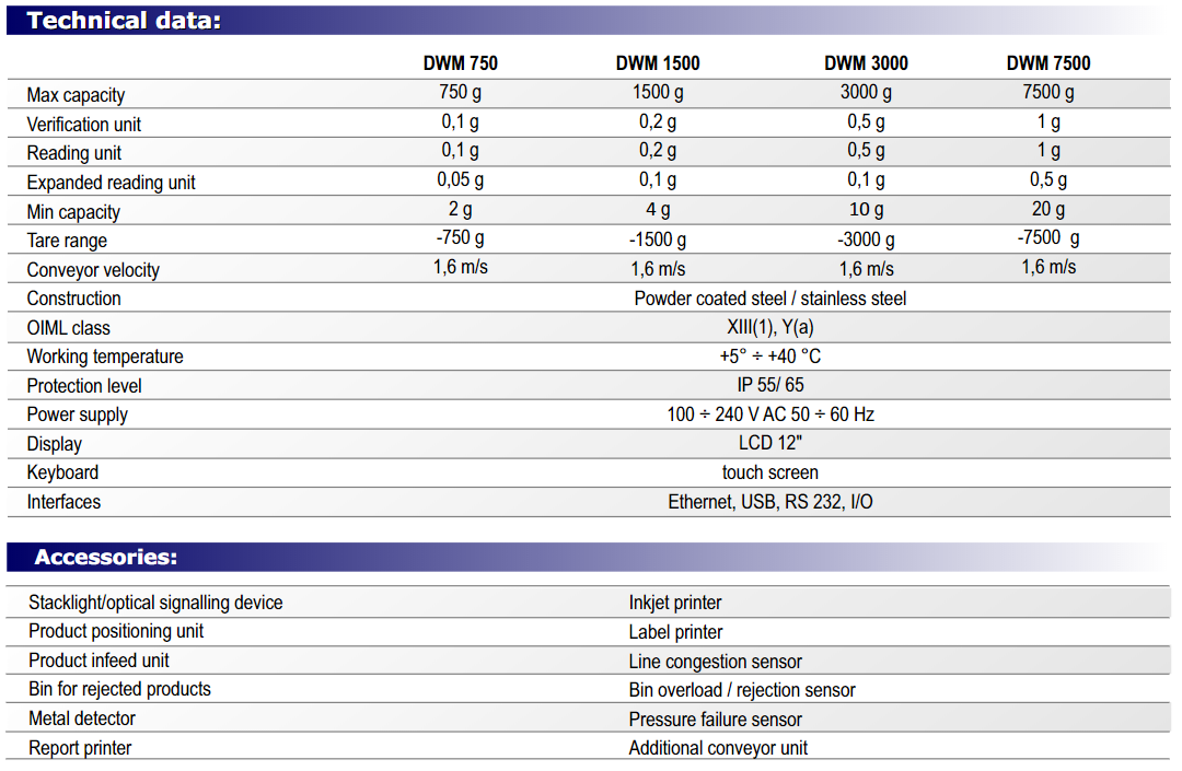 DWM自動檢重秤系列設計用於控制質量不大於7500 g的單一產品。 Scale軟件可根據客戶規定或根據現行的包裝商品控制規定設置參數。靈活的限制工作模式是針對藥物問題而設計的。 DWH自動秤系列由NIH證實。