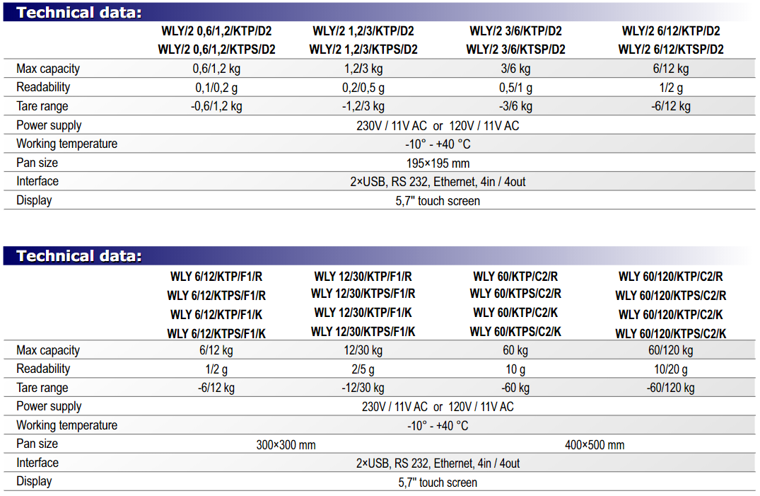 WLY 旨在快速準確地確定實驗室和工業條件下的質量。該型號系列是對簡單操作和稱重過程最大自動化的不斷增長的市場需求的響應。這些秤可與條形碼掃描儀,打印機,標籤打印機,RFID閱讀器和標準PC設備(鼠標,鍵盤,USB存儲設備)配合使用。