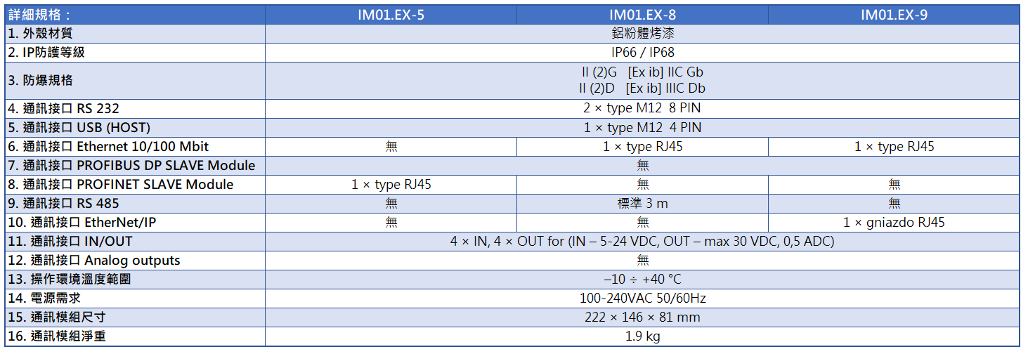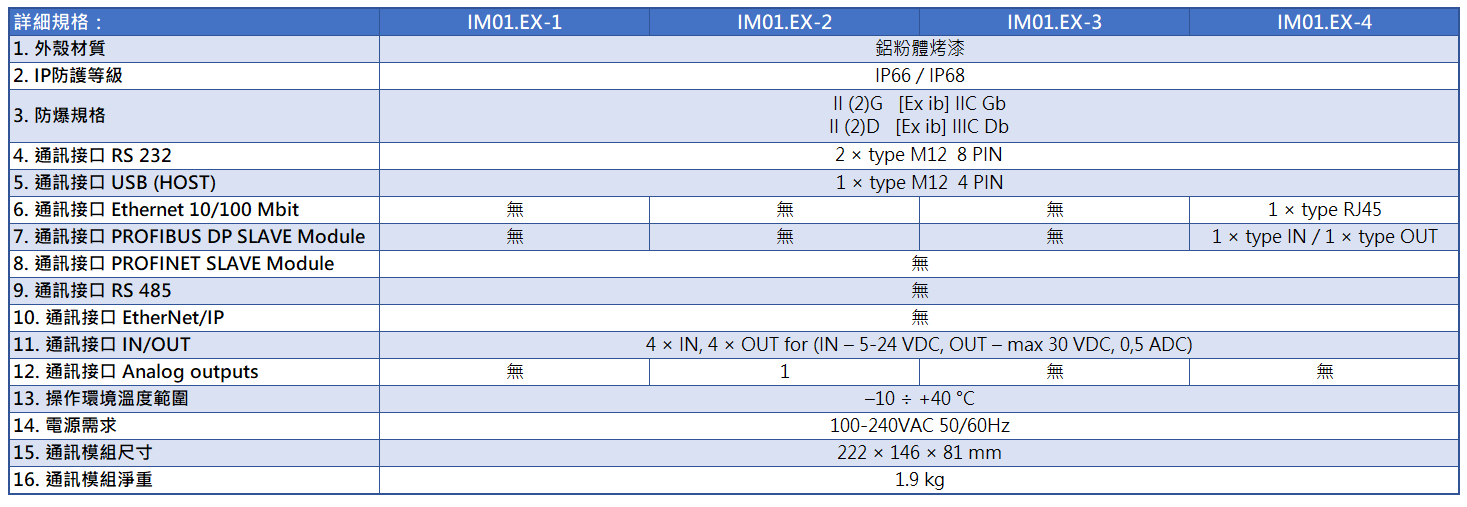 IM01.EX 防爆通訊模組所包含之傳輸介面: