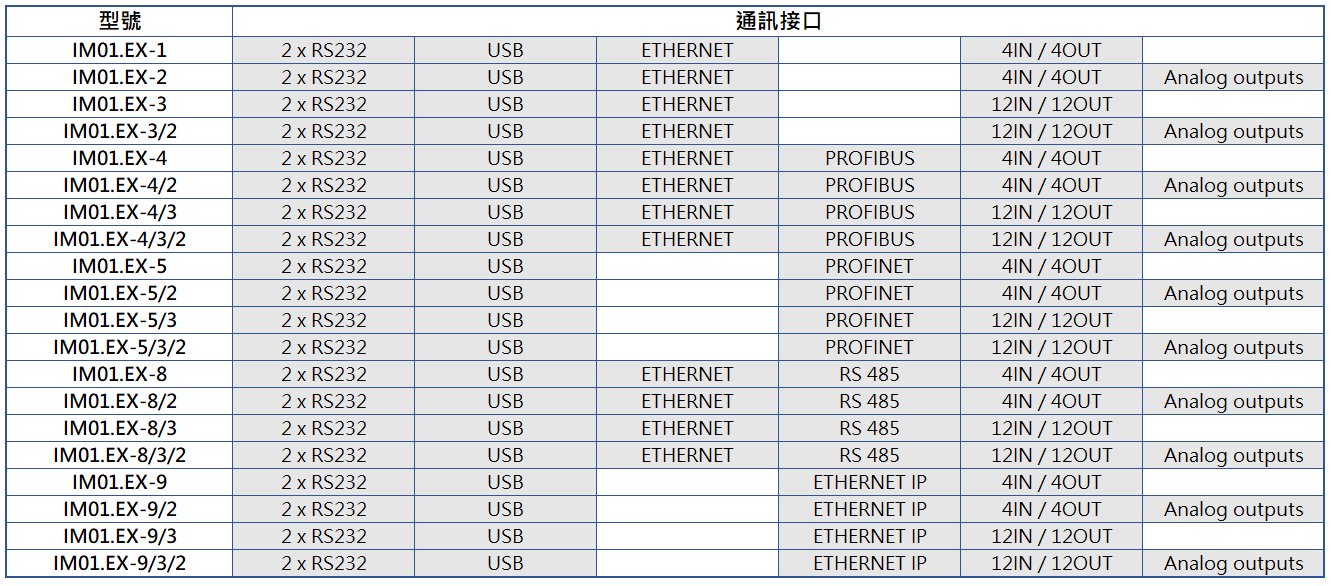 下列型號除上述IM01.EX-1所包含之所有標準介面外,另含: