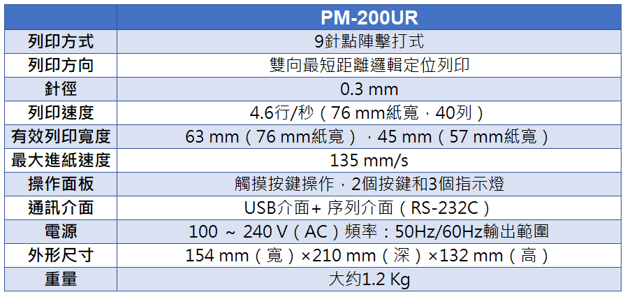 PM-200UR 點陣式印表機,操作面板為觸摸式按鍵及指示燈,操作簡易。紙張類型為普通印表紙。本印表機內含序列 RS232與 USB兩種傳輸介面。