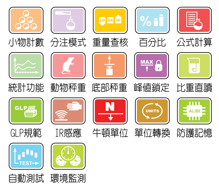 1. 內砝碼校正,可調整依據溫差或時間自動校正;亦可作標準/自定外砝碼校正
