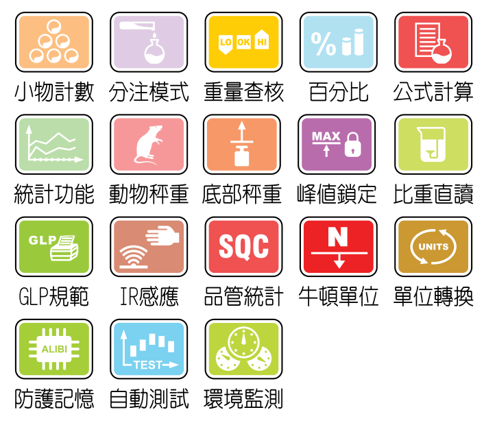 6. 具備多種秤重模式,包括小物計數、公式計算、統計功能、單位轉換、百分比、重量查核、動物秤重、分注、累進計重、峰值鎖定、比重測定(軟體)