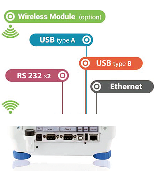 7. RS232 x2, Type-A/Type-B USB可外接電腦、鍵盤、條碼掃瞄器、印表機、隨身碟、顯示器、外接按鈕。標配乙太網路(Ethernet)、WiFi傳輸模組